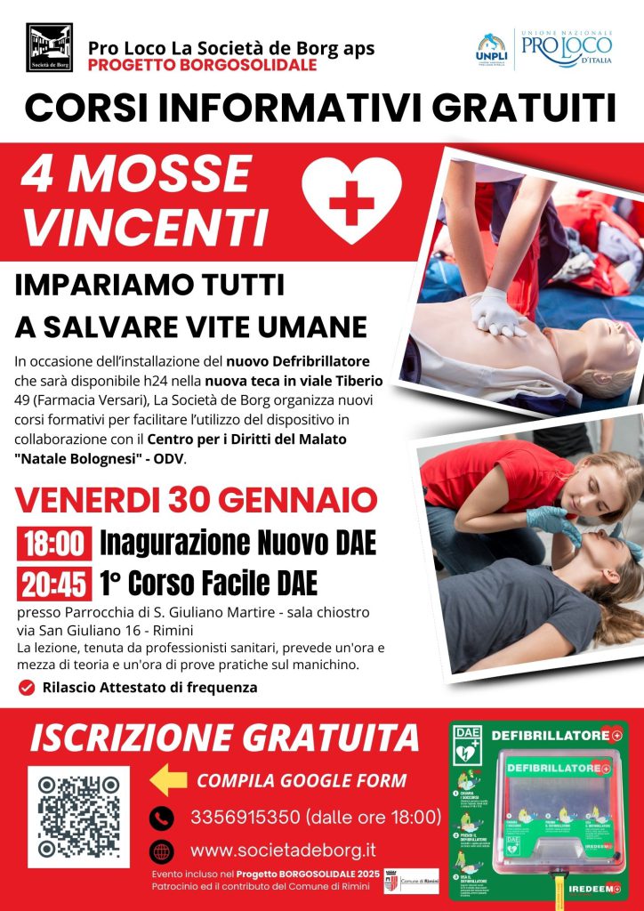 In occasione dell’installazione del nuovo defiblillatore La Società de Borg organizza corsi formativi per facilitare l’utilizzo del dispositivo in collaborazione con il Centro per i Diritti del Malato “Natale Bolognesi” – ODV.